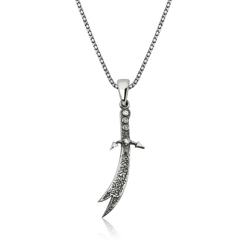 Hazrat Ali displayed great heroism in the Battle of Uhud. While trying to protect the Prophet (PBUH), his sword broke. Witnessing this, the Prophet (PBUH) gave him his own sword, Zülfikar. With its sharpness, it split other swords in half and became legendary in battles. Hazrat Ali continued to fight with Zülfikar... After his passing, it is believed the sword was taken to heaven. Another legend claims it lies between the Tigris and Euphrates rivers. The one who possesses it will command Islamic armies as their chief commander. This elegant necklace makes a perfect gift for birthdays, Valentine's Day, or special occasions. Crafted from 925 sterling silver with oxidized plating, it maintains its shine while giving the silver a blackened finish. Like all necklaces, this Zülfikar sword pendant is entirely handcrafted and features zircon stones. Due to silver and precious stones, the stated average weight may vary by ±10%.